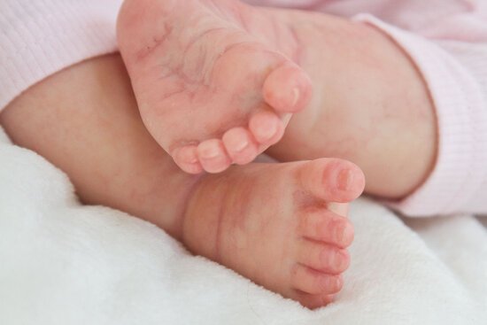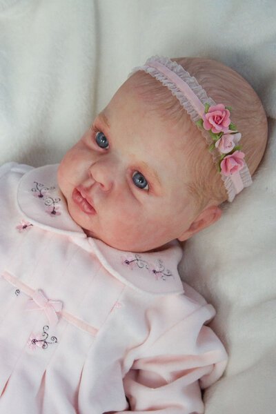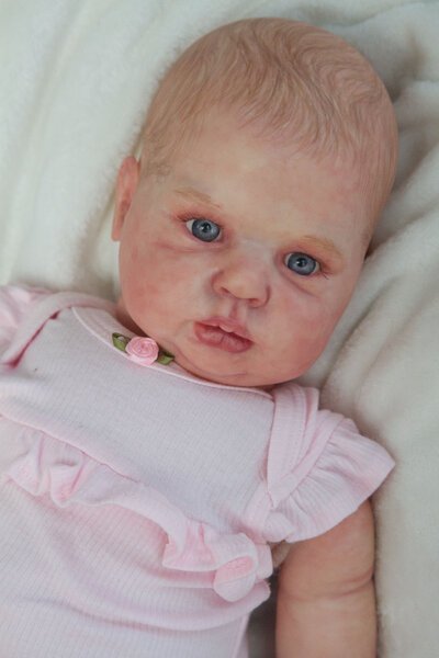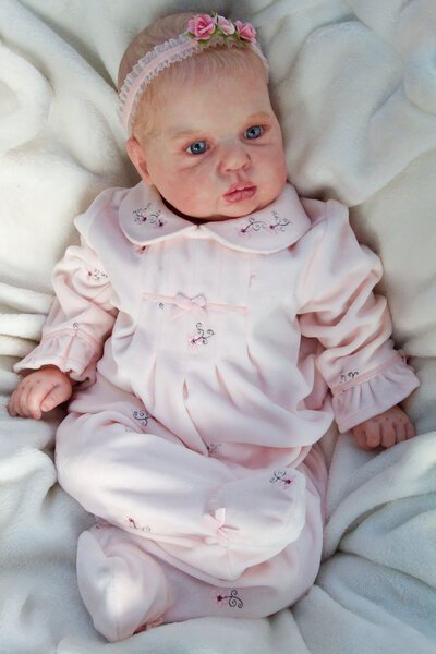 Crystal is an adorable 3-6 month old baby girl. She has been painted in the strawberries and cream complexion. I love her chunky dropping checks that baby tend to have. She has 3/4 legs and full arms in a jointed body that allows her to move more freely. Her hair in painted in soft browns and blonde highlights.