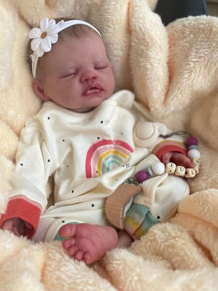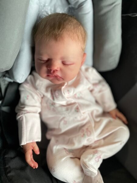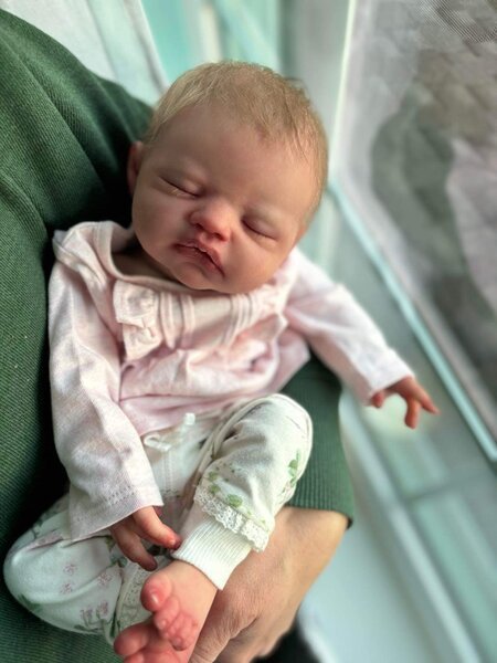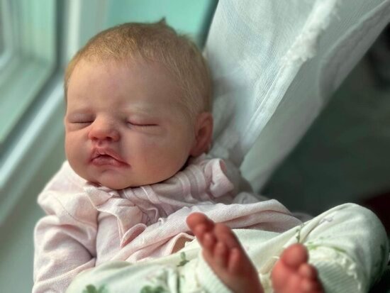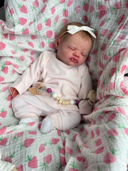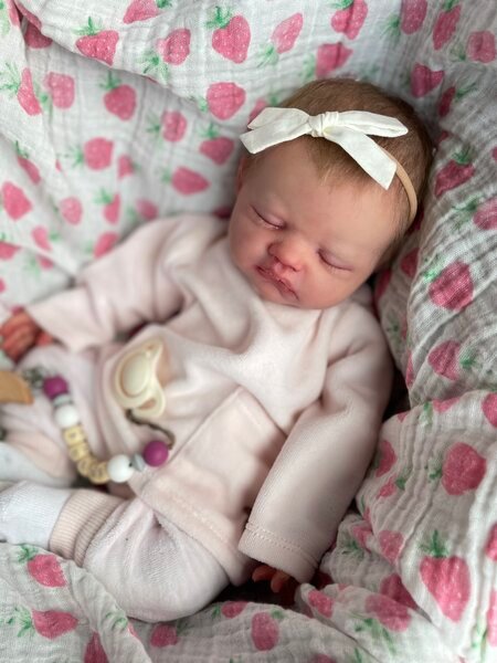 Jules by Lisa Stone is a princess! She’s so sweet and the perfect newborn. She curls up in your arms and is weighted to feel like a real baby. Her hair is rooted and she has so much realism and details.