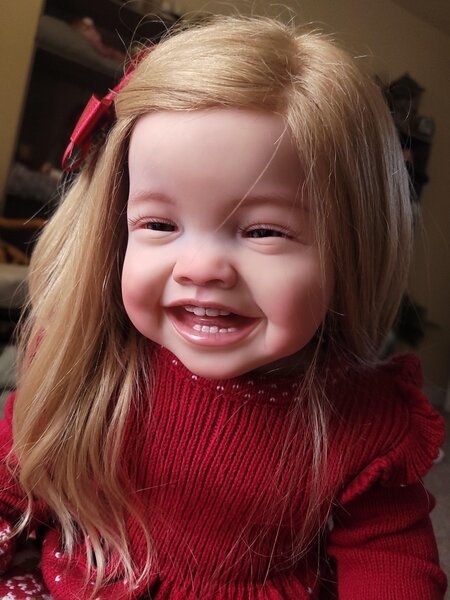Mila by Ping Lau, reborned by Boona’s Babies. Mila is in perfect, like new condition. I purchased her directly from the artist and she has only been displayed. Mila is a 28″ toddler with full vinyl limbs and a partial vinyl torso. She has rooted blond human hair and blue glass eyes. Does take a magnetic pacifier. She wears 6-12 month clothes. She will come with a full box opening.