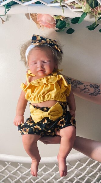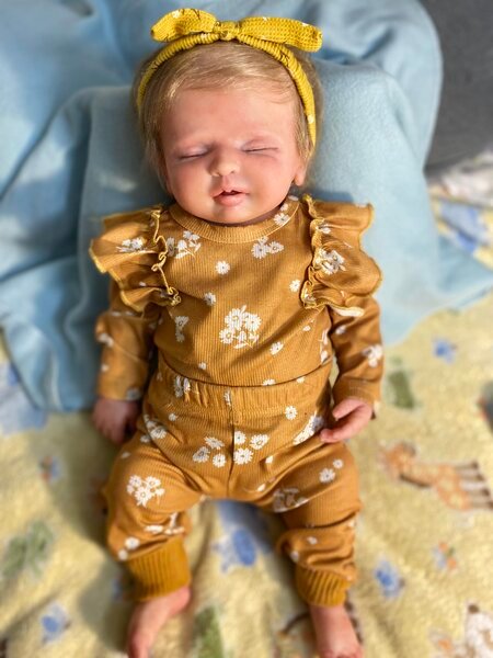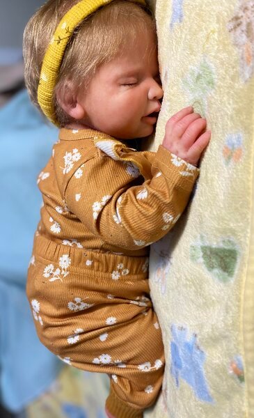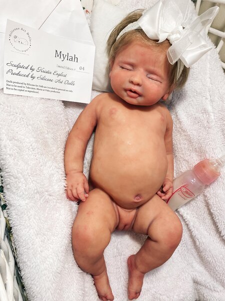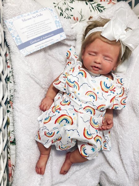 Unfortunately while I was moving, my 4 year old pulled some of her rooting out, so she could use a touch up/ re root on her hair and eyelashes. But it’s not necessary as she can still be enjoyed as is. She does accept a full pacifier with her fully sculpted mouth and tongue. She is 13 lbs of adorable and I love her unique sculpt. Her hands and feet are the most realistic hands and feet on a silicone doll that I’ve ever seen. Her fingers actually wrap around your hand like a real baby! She is in great condition and ready for her new home. Take this beautiful girl home today!